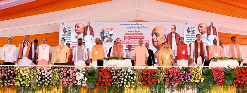 मुख्यमंत्री ने आज जनपद बाराबंकी में लौहपुरुष सरदार वल्लभ भाई पटेल की 150वीं जयन्ती समारोह अभियान के अन्तर्गत ‘एकता यात्रा’ के शुभारम्भ अवसर पर 1,734 करोड़ रुपये की 254 विकास परियोजनाओं का लोकार्पण एवं शिलान्यास करने के उपरान्त आयोजित कार्यक्रम में अपने विचार व्यक्त कर रहे थे। इसके पूर्व, मुख्यमंत्री जी ने विभिन्न विभागों द्वारा आयोजित प्रदर्शनी का अवलोकन किया तथा विभिन्न योजनाओं के लाभार्थियों को प्रतीकात्मक चेक/प्रमाण-पत्र वितरित किये। इस अवसर पर उन्होंने सरदार वल्लभ भाई पटेल तथा बाबा साहब डॉ0 बी0आर0 आम्बेडकर की प्रतिमा पर पुष्प अर्पित कर उन्हें श्रद्धांजलि दी तथा बच्चों का अन्नप्राशन भी कराया।