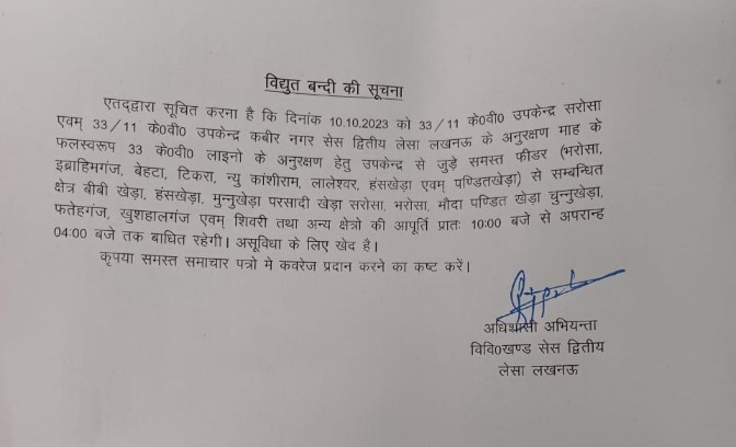 10 अक्टूबर को लखनऊ में इन क्षेत्रों में बिजली आपूर्ति बाधित रहेगी