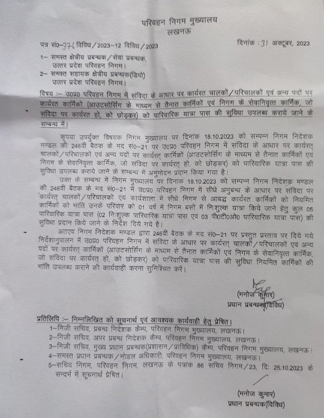 परिवहन मंत्री ने बताया कि निदेशक मण्डल की 246वीं बैठक में इस संबंध में निर्णय लिया गया था कि उन्होंने बताया कि उत्तर प्रदेश परिवहन निगम में सीधे अनुबंध के आधार पर संविदा पर कार्यरत चालकों/परिचालकों एवं कार्यशाला में सीधे निगम से आबद्ध कार्यरत कार्मिकों को नियमित कार्मिकों की भांति उनके परिवार को एक वर्ष में निगम बसों में निःशुल्क यात्रा किये जाने के लिए कुल पांच पारिवारिक यात्रा पास दिये जायेंगे। इसमें से दो निःशुल्क पारिवारिक यात्रा पास एवं 3 पीटीओ पारिवारिक यात्रा पास की सुविधा रहेगी।