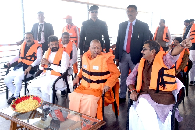 गंगा द्वार से सीएम योगी क्रूज पर सवार हो डोमरी पड़ाव कथा स्थल पर पहुंचे