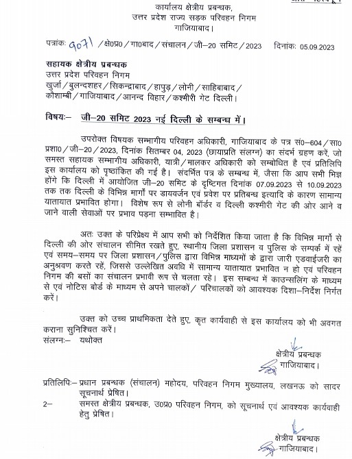 गाजियाबाद, 5 सितंबर। दिल्ली में आयोजित होने जा रही जी-20 समिट के चलते 07 सितंबर से 10 सितंबर तक तक दिल्ली के विभिन्न मार्गों पर डायवर्जन एवं प्रवेश पर प्रतिबन्ध इत्यादि के कारण सामान्य यातायात प्रभावित होगा। ऐसे में उत्तर प्रदेश सड़क परिवहन निगम ने विभिन्न मार्गों से दिल्ली की ओर संचालन सीमित रखने का निर्णय किया है। इस संबंध में क्षेत्रीय प्रबन्धक गाजियाबाद की ओर से सहायक क्षेत्रीय प्रबन्धक खुर्जा, बुलन्दशहर, सिकंदराबाद, हापुड़, लोनी, साहिबाबाद, कौशाम्बी, गाजियाबाद, आनन्द विहार और कश्मीरी गेट दिल्ली को पत्र लिखा है।