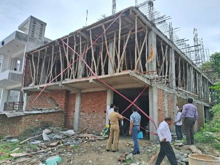 निरीक्षण के दौरान खसरा संख्या-687मि व 687/1, ग्राम-हरसांव, निकट-शास्त्रीनगर, गाजि0 पर नितिन कुमार शर्मा एवं रवि कुमार शर्मा द्वारा बिना मानचित्र स्वीकृत कराये लगभग 250.00 वर्ग मी0 में भूतल पर कॉलम खडे किये जाने पर वाद संख्या-002811/अ0नि0/24 योजित कर दिनांक 24.04.2024 को सीलिंग की कार्यवाही की गयी थी, परन्तु निर्माणकर्ता द्वारा हठधर्मिता अपनाते हुए सील परिसर में पुनः किये जा रहे अवैध निर्माण को प्रवर्तन जोन-4 की टीम, पुलिस बल की उपस्थिति में पुनः विधिवत् सीलिंग की कार्यवाही की गयी।