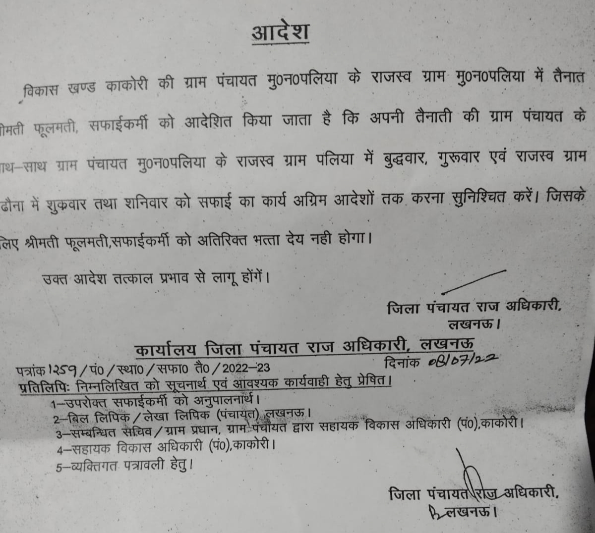 काकोरी विकास खण्ड की ग्राम पंचायत मुजफ्फरनगर पलिया में सफाई कर्मचारी फूलमती तैनात है।जिसमें तीन राजस्व ग्राम मुजफ्फरनगर,बेढ़ौना,पलिया है। बीती 8 जुलाई पत्रांक संख्या 1259 को जिला पंचायत राज अधिकारी शास्वत आंनद ने एक आदेश कि अग्रिम आदेश तक मुजफ्फरनगर पलिया ग्राम पंचायत के सभी राजस्व गांवों की साफ सफाई फूलमती को ही करना है। जिसको लेकर अन्य सफाई कर्मचारियों में रोष व्याप्त है। ग्राम प्रधान/प्रधान संघ अध्यक्ष आंनद यादव ने बताया कि एक महिला 3-3 गांवों की सफाई कैसे कर सकती है। उन्होंने कहा कि डीपीआरओ अपनी बात मनवाने के लिए महिला कर्मचारी का जानबूझकर उत्पीड़न कर रहे हैं। जोकि पूरी तरह से गलत है। सफाई कर्मचारी फूलमती का कहना है कि मेरे अधिकारियों का जो भी आदेश होगा, मैं उसका पालन करूँगी।