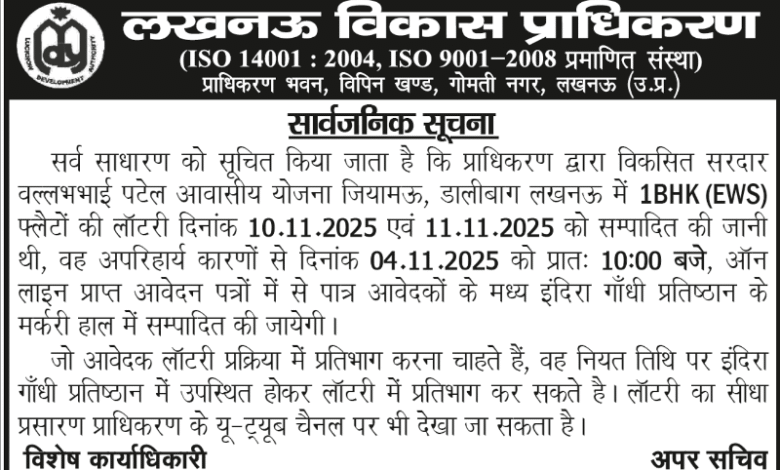 लखनऊ विकास प्राधिकरण द्वारा विकसित सरदार वल्लभभाई पटेल आवासीय योजना, जियामऊ, डालीबाग, लखनऊ के अंतर्गत 1 BHK फ्लैटों की लॉटरी दिनांक 10.11.2025 एवं 11.11.2025 को संपादित की जानी थी।