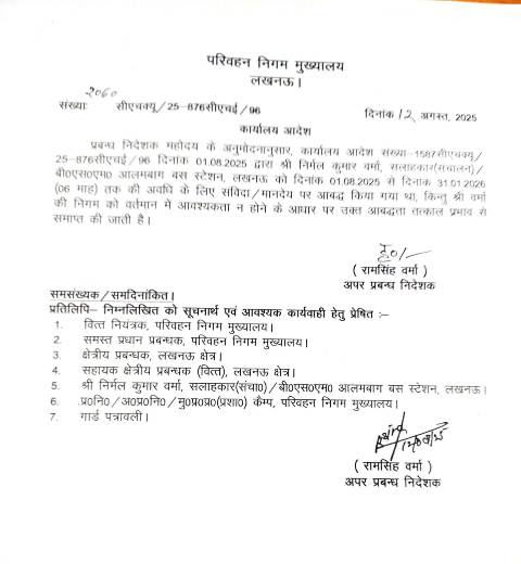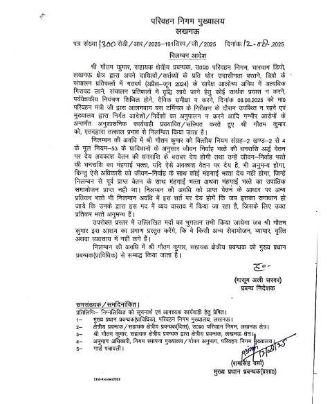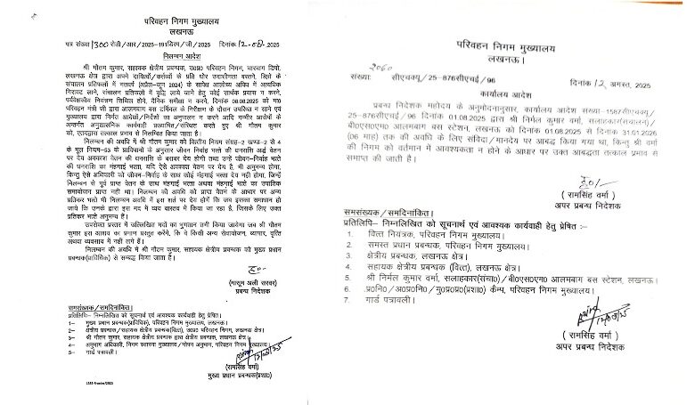 उत्तर प्रदेश सरकार के परिवहन राज्य मंत्री (स्वतंत्र प्रभार) दयाशंकर सिंह के निर्देश पर चारबाग डिपो के सहायक क्षेत्रीय प्रबंधक (ए.आर.एम.) गौतम कुमार को तत्काल प्रभाव से निलंबित कर दिया गया है। साथ ही, आलमबाग बस स्टेशन पर कार्यरत संचालन सलाहकार निर्मल कुमार वर्मा, जो संविदा पर कार्यरत थे, की सेवाएं समाप्त कर दी गई हैं।