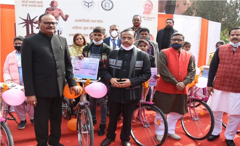 इस अवसर पर उप मुख्यमंत्री ने श्रम विभाग द्वारा संचालित संत रविदास शिक्षा सहायता योजना के तहत लाभार्थियों को साइकिल देकर पुरस्कृत किया। इसके साथ ही चिकित्सा सुविधा योजना के लाभार्थियों को भी इस अवसर पर तीन हजार रूपये के चेक प्रदान किये गये।