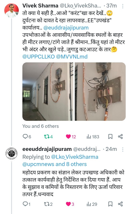 उपभोक्ताओं के आवासीय/व्यवसायिक स्थलों के बाहर ही मीटर लगाए/टांगे जाते हैं श्रीमान..किंतु यहां तो मीटर भी अंदर और खुले पड़े..जुगाड़ु कटआउट के तार🤔@UPPCLLKO @MVVNLmd pic.twitter.com/DbGLDozivc— Vivek Sharma (@Lko_VivekSharma) May 10, 2024