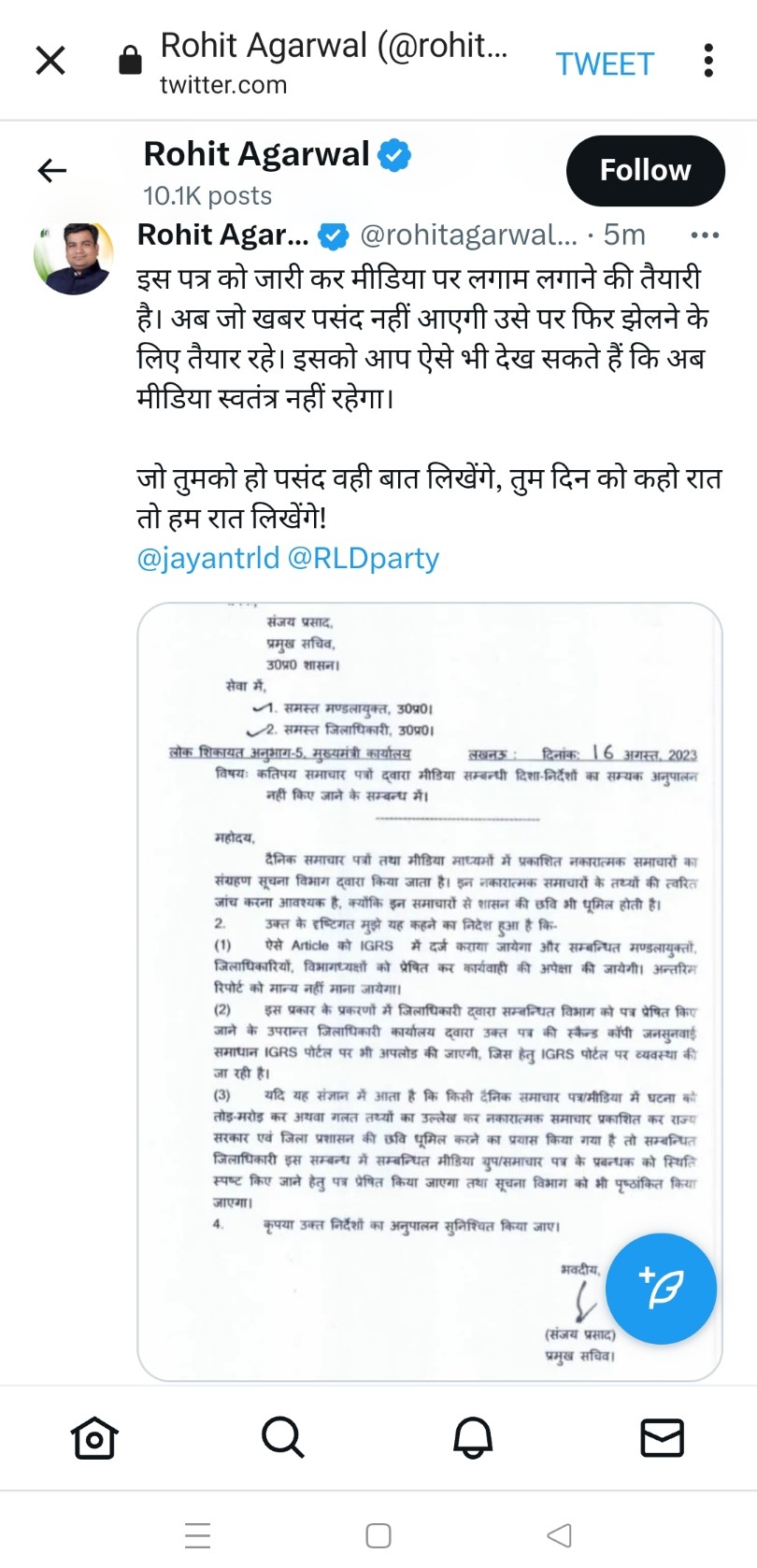 आरएलडी: रोहित अग्रवाल ने ट्विटर पर प्रमुख सचिव के पत्र पर ली चुटकी