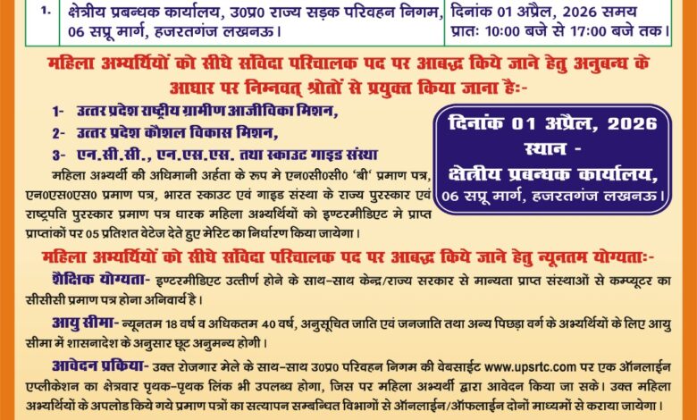 2584 पदों पर अनुबंध के आधार पर संविदा महिला परिचालकों की भर्ती के लिए रोजगार मेले का आयोजन करेगा परिवहन निगम