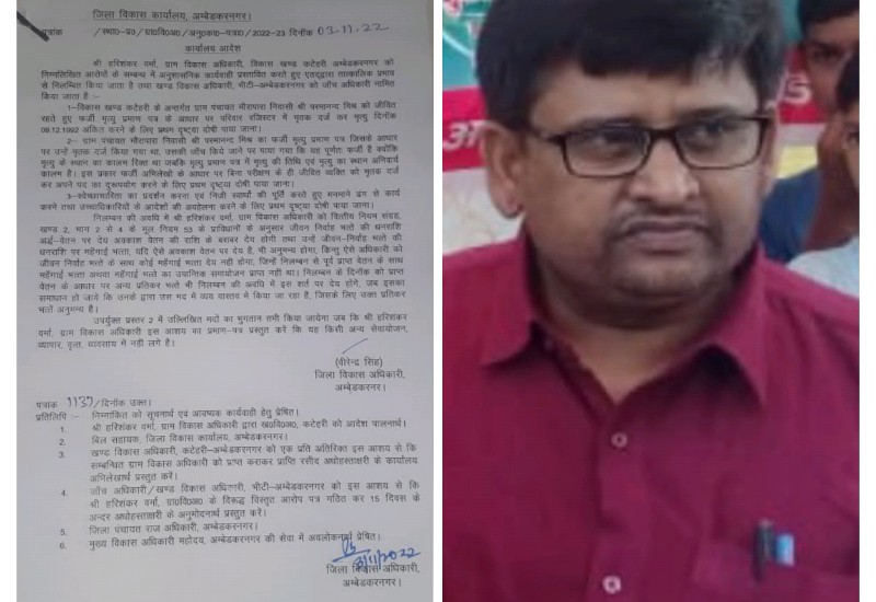 फर्जी अभिलेखो के आधार पर बिना परीक्षण के ही जीवित व्यक्ति को मृतक दर्ज कर अपने पद का दुरूपयोग करने के लिए आखिरकार ग्राम विकास अधिकारी हरिशंकर वर्मा को जिला विकास अधिकारी वीरेंद्र सिंह ने निलंबित कर दिया। जांच में यह बात स्पष्ट हुई थी की जिस व्यक्ति को परिवार रजिस्टर में मृतक दिखाया गया था उस व्यक्ति के मृत होने की कोई जानकारी है।