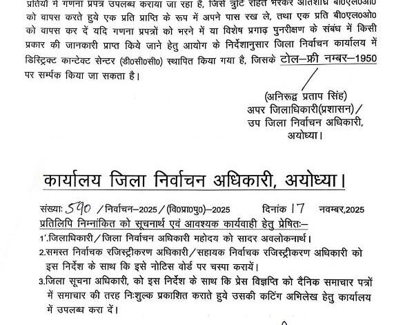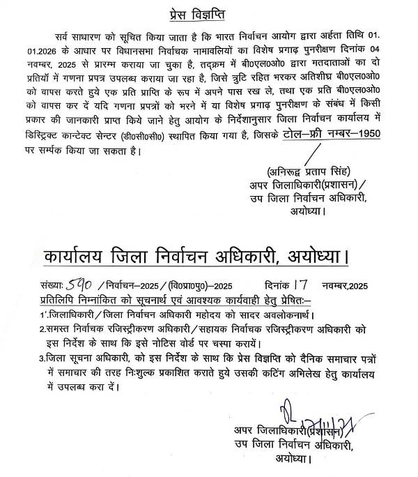 उप जिला निर्वाचन अधिकारी अनिरुद्ध प्रताप सिंह द्वारा सर्वसाधारण को सूचित किया जाता है कि भारत निर्वाचन आयोग के निर्देशानुसार अर्हता तिथि 01 जनवरी 2026 के आधार पर विधानसभा निर्वाचक नामावलियों का विशेष प्रगाढ़ पुनरीक्षण दिनांक 04 नवम्बर 2025 से प्रारंभ किया जा चुका है।